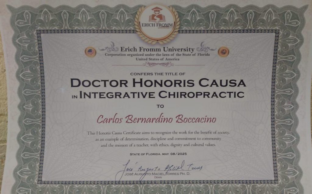 Após indicação para titulação, cumprir os requisitos exigidos, entrevista por 3h, submeter à aprovação, recebi o título de Dr HC – Honoris Causa, pela Erich Fromm University, Florida EUA, em 08/05/2025…🥰 Muito feliz por essa conquista profissional aos 25 anos de carreira em QUIROPRAXIA…
